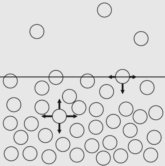 在解析表面張力的成因是,往往能遇到類似圖1的示意圖,并作出以下的敘述:處于體相的分子被周圍的同類分子對(duì)稱地包圍,作用在其上的作用力(吸引力)相互抵消,所以凈力為零;但靠近表面、處于表面層的分子由于在垂直方向的對(duì)稱性被打破,液相分子之間的共聚力(cohesion)要大于液相分子與氣相分子之間的粘結(jié)力(adhesion),所以感受到一個(gè)向下(或指向液相內(nèi)部)的凈力(net effect),這就導(dǎo)致了表面張力的存在。表面張力導(dǎo)致的效應(yīng)如同一張覆蓋在液體表面的彈性薄膜,薄膜施加一個(gè)指向內(nèi)部的作用力,約束了液體表面積的擴(kuò)張。
