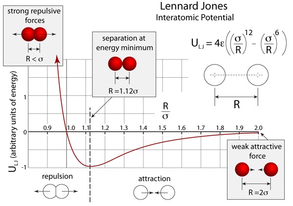 如上所說表面張力源自分子間的相互作用力。原子或分子間的作用力(或作用勢(shì)能)可以用蘭納-瓊斯作用勢(shì)能函數(shù)(Lennard-Jones potential function)來模擬/近似(見圖2)。當(dāng)原子或分子之間相距很近時(shí)(接觸),粒子間相互排斥;而當(dāng)二者相距較遠(yuǎn)時(shí),粒子間相互吸引;當(dāng)距離繼續(xù)增大、超過一很短的作用范圍(約幾個(gè)分子直徑)后,這一作用力變得極為微小、可忽略。也就是說,依據(jù)距離的大小,粒子間的相互作用力既可以是排斥的,又可以是吸引的。對(duì)于一固體而已,因?yàn)榱W拥奈恢檬墙乒潭ǖ模W娱g的距離也是近似固定的,所以粒子間的相互作用(靜)力要么是排斥的,要么是吸引的,不可能二者同時(shí)存在。但對(duì)一液體,液體中的粒子(原子或分子)的位置不是固定的,而是由于熱漲落(thermal fluctuations)可以不斷變化,其粒子間的距離也是在不斷變化的,所以液體中的粒子之間的相互作用力隨著之間的距離的變化既可以是排斥的,又可以是吸引的,二者同時(shí)存在。這里吸引力和排斥力的同時(shí)存在應(yīng)從時(shí)間(一定的觀測(cè)時(shí)間范圍內(nèi))和數(shù)量(大量液體粒子的存在)的統(tǒng)計(jì)角度來理解:每一對(duì)粒子間有時(shí)吸引有時(shí)排斥;大量粒子中有些對(duì)吸引有些對(duì)排斥。