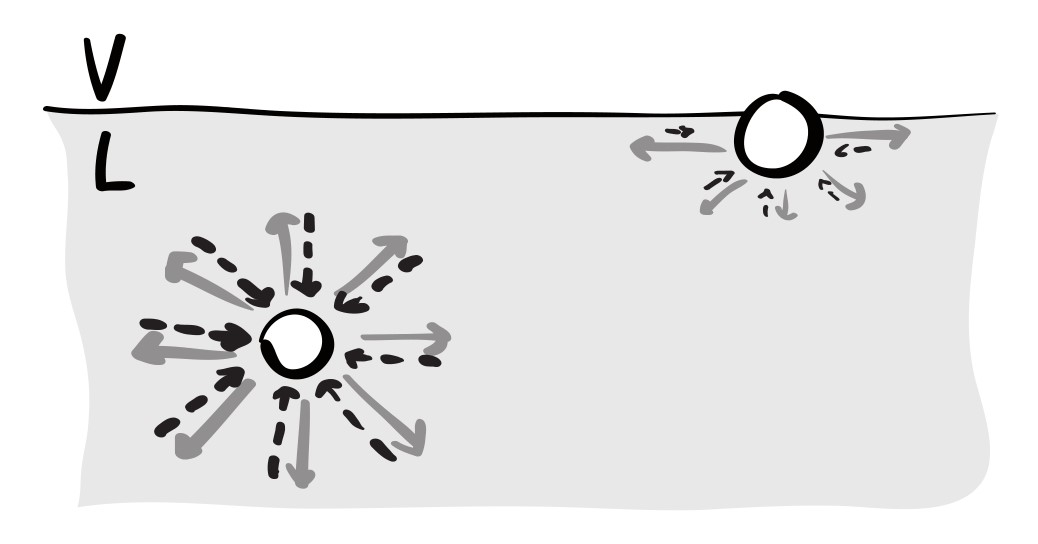 所以對(duì)于液體表面的分子,其所受到的排斥力較?。ㄒ?mark>圖3中短得多的黑箭頭),而且由于垂直方向的對(duì)稱性被破壞,缺少來自上方的排斥力。為了保持體系的平衡,必須有一與此大小相同但方向相反的吸引力來抵消這一向上的排斥力(見圖3中灰色的短小向下箭頭),也就意味著垂直方向的吸引力也是隨著不斷深入液相體相而增大,直至達(dá)到飽和值。但在同一(深度)位置的水平方向,由于(左右)對(duì)稱性仍完好,就沒有必要通過吸引力來抵消排斥力,因?yàn)閬碜愿魉椒较虻呐懦饬ψ约嚎梢韵嗷サ窒?,而其?qiáng)度隨著深入液相深度的變化與垂直方向的情形相同。但是在這一(水平)方向的吸引力,由于水平方向周圍粒子的分布密度比垂直方向要高,就可以大于排斥力(見圖3中灰色的較長的向左、向右的箭頭),因?yàn)槲κ侨菰S各向異性的(也即各個(gè)方向的力的強(qiáng)度可以不一樣)。