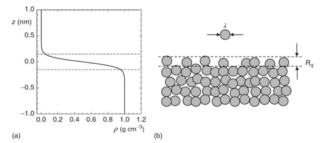 現(xiàn)在再回過來看圖1示意圖,圖中只給出了粒子間的相互吸引力,沒有給出同時(shí)存在的相互排斥力,所以是不完整的。一個(gè)更完整的示意圖(見圖3)應(yīng)同時(shí)表示出同樣存在的相互排斥力(如圖3中的虛線所示)。對(duì)一處于液體體相的粒子,由于其所處周圍空間的對(duì)稱性,作用于其上的排斥力和吸引力在各個(gè)方向均一樣大,而且排斥力等于吸引力(否則液體的體積將膨脹或收縮)。這一情況對(duì)于一處于表面的粒子就不一樣:沿著垂直表面的方向從氣相進(jìn)入液相,粒子的密度在幾個(gè)分子(或原子)層的距離(空間)中,就跳躍性地從氣相的密度增加到液相的密度(見圖4)。這也同時(shí)意味著,粒子之間的排斥力從(氣相中的)忽略不計(jì),經(jīng)過幾個(gè)分子層,跳躍性地增加到體相的強(qiáng)度。在這一增加過程中,由于排斥力的各向同性本質(zhì),其在任一位置的強(qiáng)度在各個(gè)方向是一樣的。