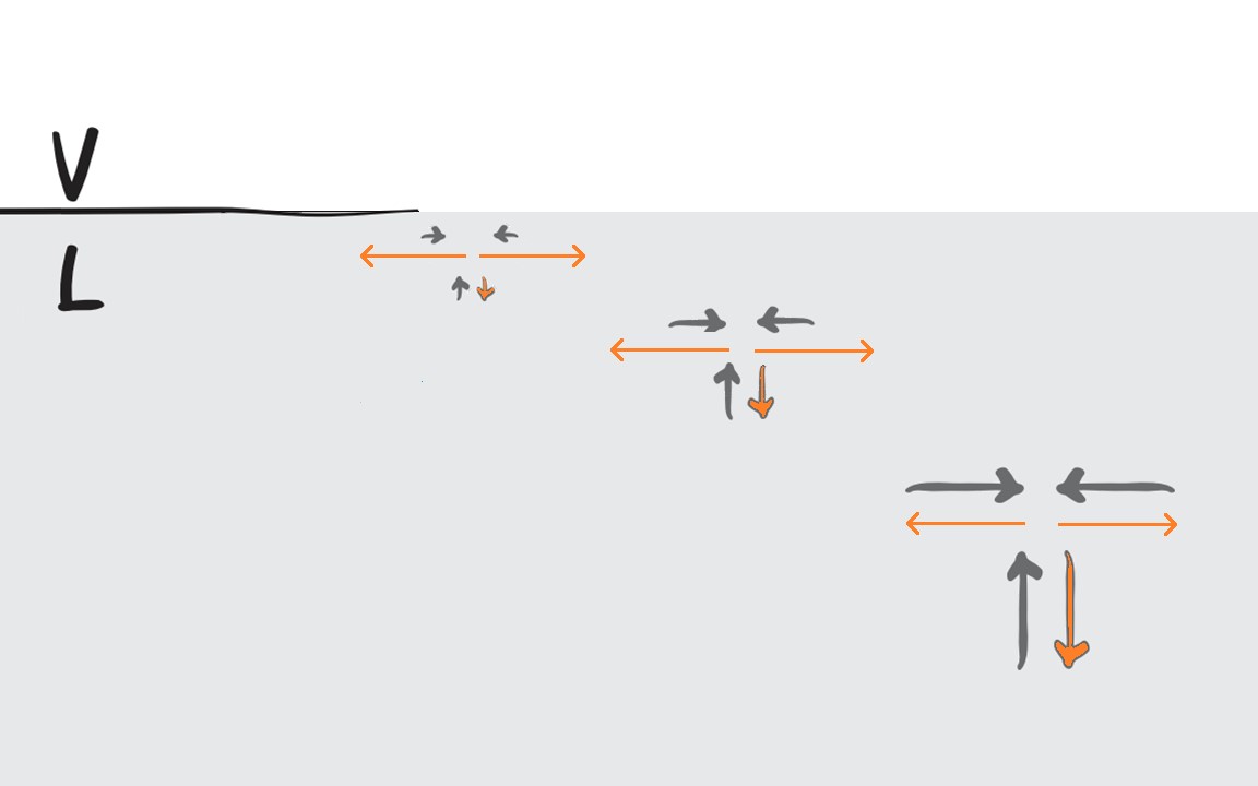 圖5給出了,在垂直于表面方向、從體相到表面層的不同位置的排斥力和吸引力的強(qiáng)度變化:各個(gè)方向的排斥力不斷減弱,但水平方向的吸引力的衰減則緩慢的多,幾乎始終那么強(qiáng)。對(duì)于粒子來說,不管在哪個(gè)位置,其所受到的凈力始終為零,因?yàn)轶w系處于平衡狀態(tài)(氣相和液相處于平衡)。