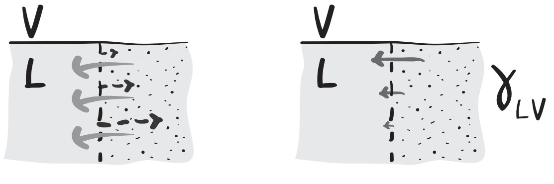 同樣的解析也可以通過對(duì)表面的流體靜力平衡(hydrostatic equilibrium)分析來得出。圖7給出了一水平表面二相附近的壓力張量(pressure tensor)分量的分布。在一各向同性的相,所有壓力張量的非零分量均數(shù)值相同,這一數(shù)值通常也被稱為壓強(qiáng)或壓力。但表面并非同性的相,但其中垂直于表面的壓力張量分量PN是一不變的恒值(否則表面將發(fā)生移動(dòng)而不再處于平衡),數(shù)值上等同于二相中的壓力。平行于表面的切向壓力張量分量PT反映了二相間過度狀態(tài)層(區(qū)域)中的相互作用。表面張力相當(dāng)于這二個(gè)分量差(PN - PT)在整個(gè)過度區(qū)域的積分總和。