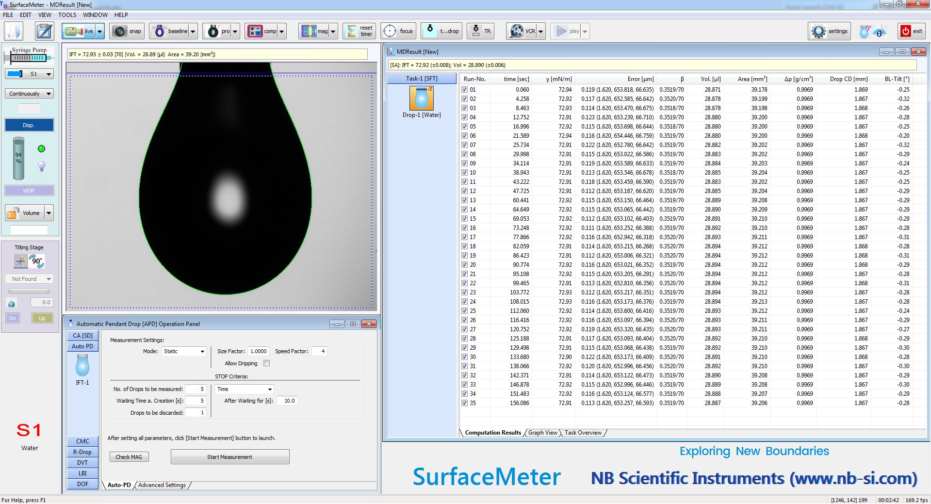 圖7:用懸滴法測量水的表面張力,顯示出測量結果的高度穩(wěn)定性下圖是在一正己烷液相中形成的一水滴(懸滴),用來測量水/正己烷-體系的界面張力。圖中的綠線表示理論計算得到的液滴輪廓線,它與實際得到的液滴圖像輪廓之間的縫合程度展現(xiàn)出擬合結果的準確性。
